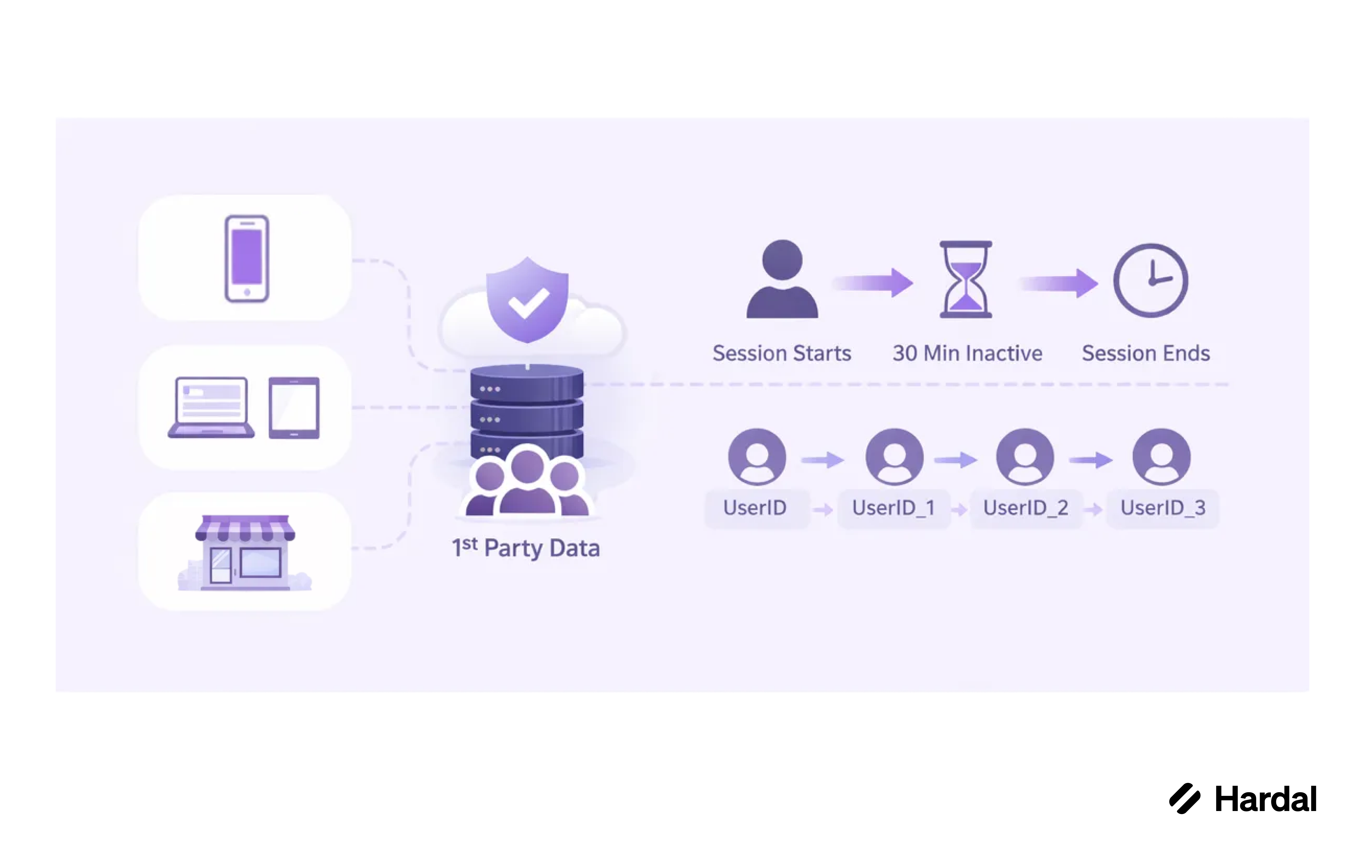 A session is a period of continuous activity when a user is engaged with your website or app. At Hardal, we count and track sessions across your stack with a precise algorithm that handles session attribution, user journey tracking, and data segmentation—all using first-party data. A session starts from browser or app or even online/offline store, using server-to-server tracking when the user becomes active and ends after 30 minutes of inactivity, so you get a clear picture of how many distinct visits and journeys you have.