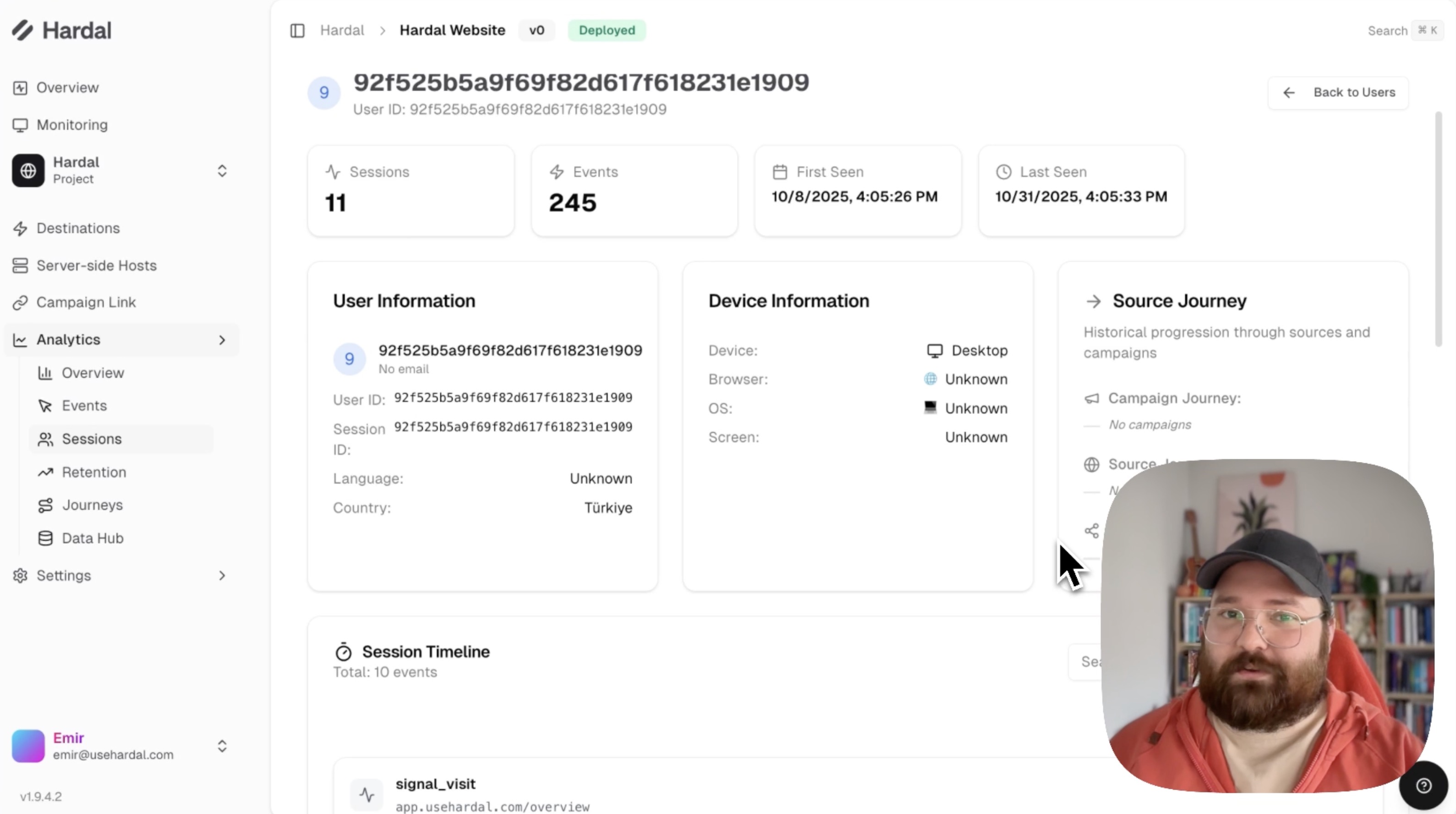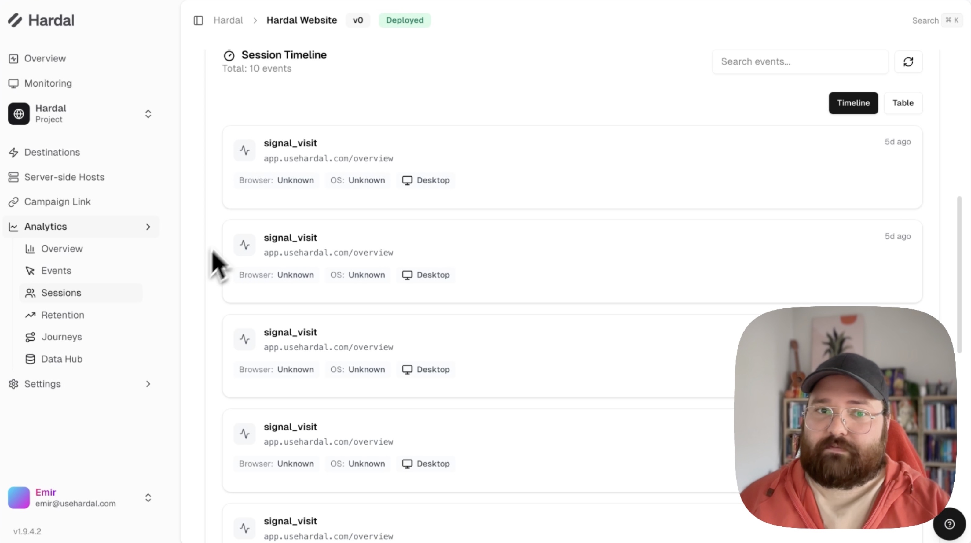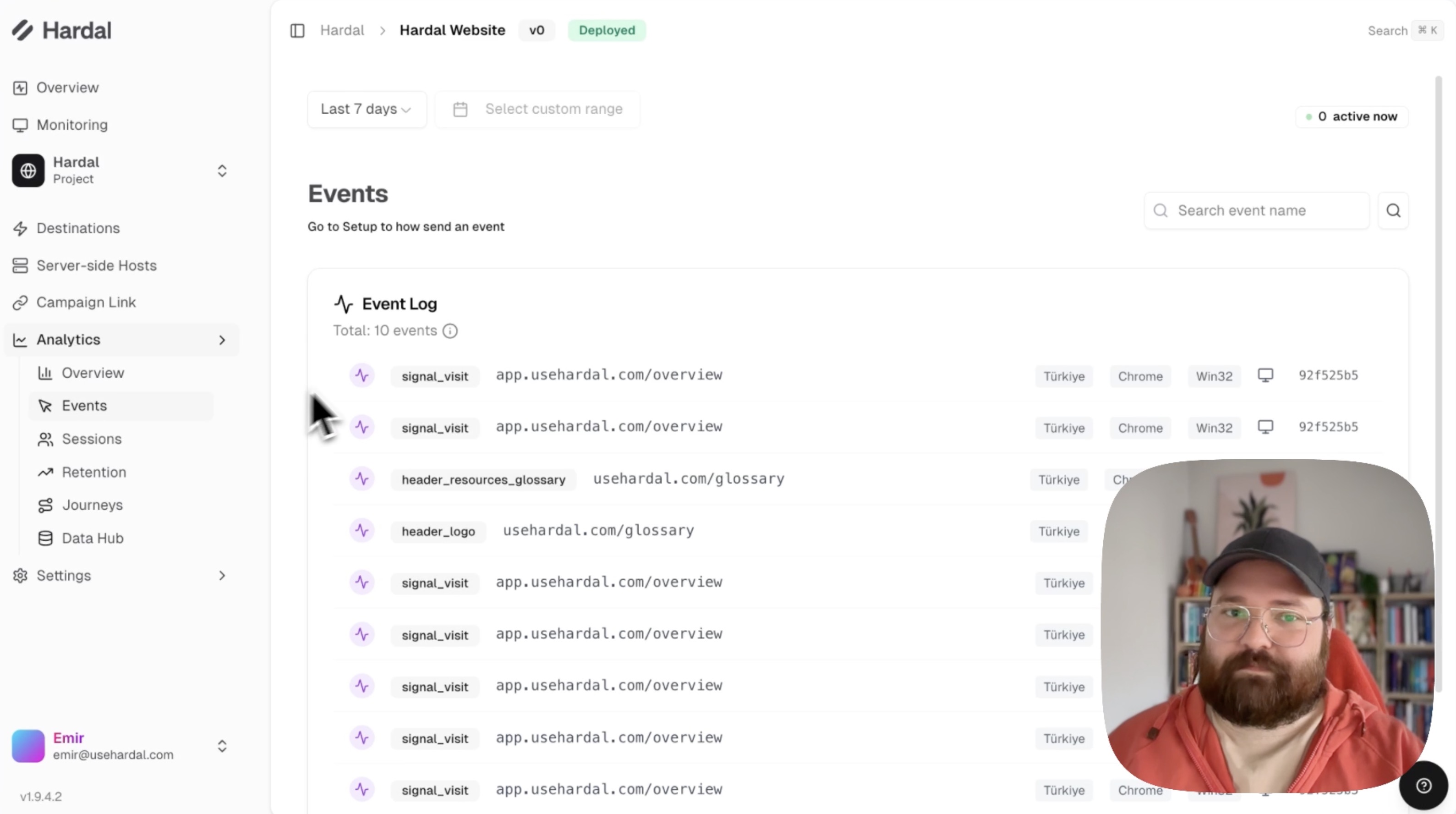 Hardal's Events and Sessions pages provide detailed insights into individual user interactions and browsing sessions. This guide explains how to use these features for in-depth analytics.