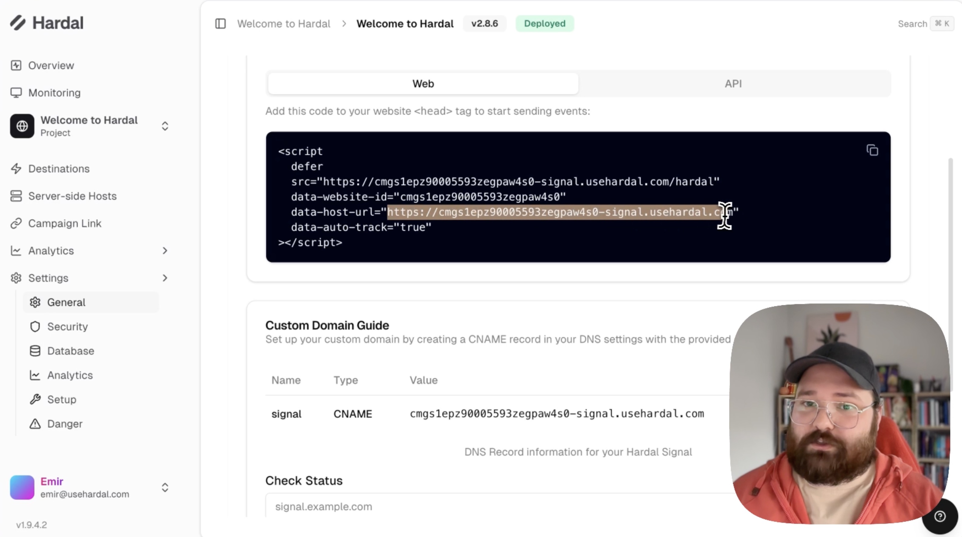 Once verification is complete, your Hardal tracking script will automatically update with your first-party domain. The URL section will now reference your custom domain instead of Hardal's default domain.