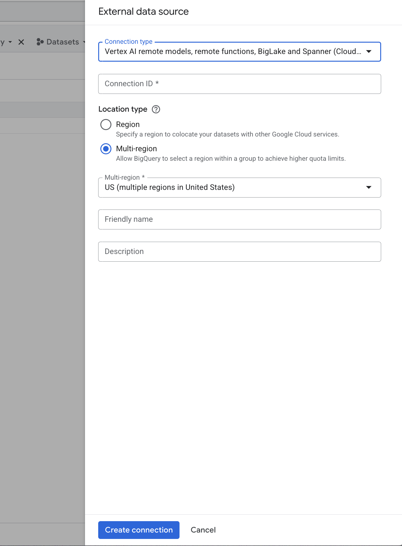 <your-any-connection-id> - Region: (Same region as Cloud Function and BigQuery Tables)
