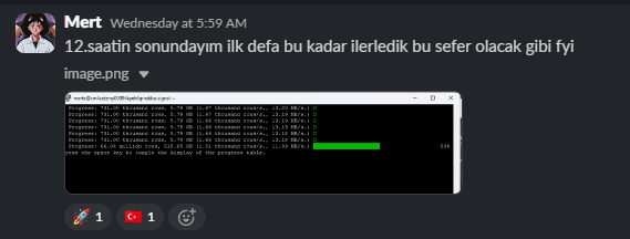 Bu yöntemi kullanarak işlemi başlattık. İşlemin %1'inin tamamlanması yaklaşık 5 dakika sürdü. Basit bir matematikle hesapladığımızda (5 × 100), işlemin yaklaşık 500 dakika (~8 saat) içinde tamamlanacağını öngördük.